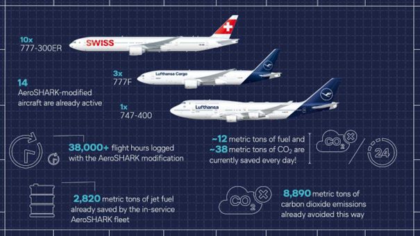 Entretanto, a Lufthansa, que está implantando a tecnologia AeroSHARK em parte de sua frota, estima que essa película especial pode reduzir o consumo de combustível e as emissões de CO2 em cerca de 1% a 3% por voo. Embora pareça uma porcentagem pequena, a economia total é significativa quando se considera a escala das operações de uma companhia aérea.